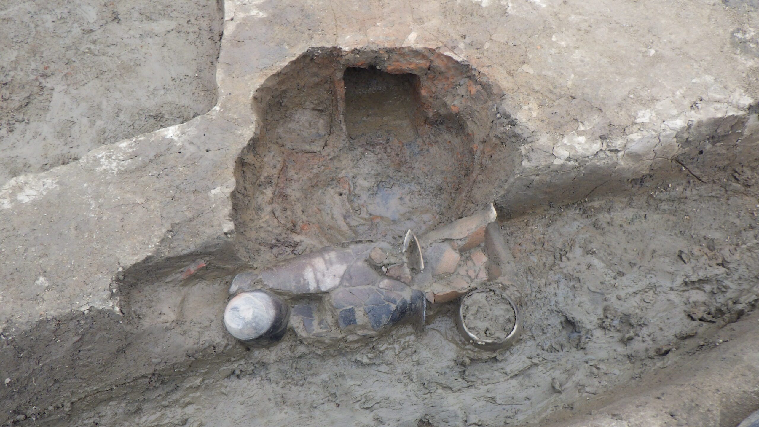8世紀末頃の竪穴住居跡のカマドです。カマドの骨組みに土師器の甕が転用されていました。左右の両袖と天井を渡るように組み上げ、これと粘土を覆わせてカマドが造られていました。