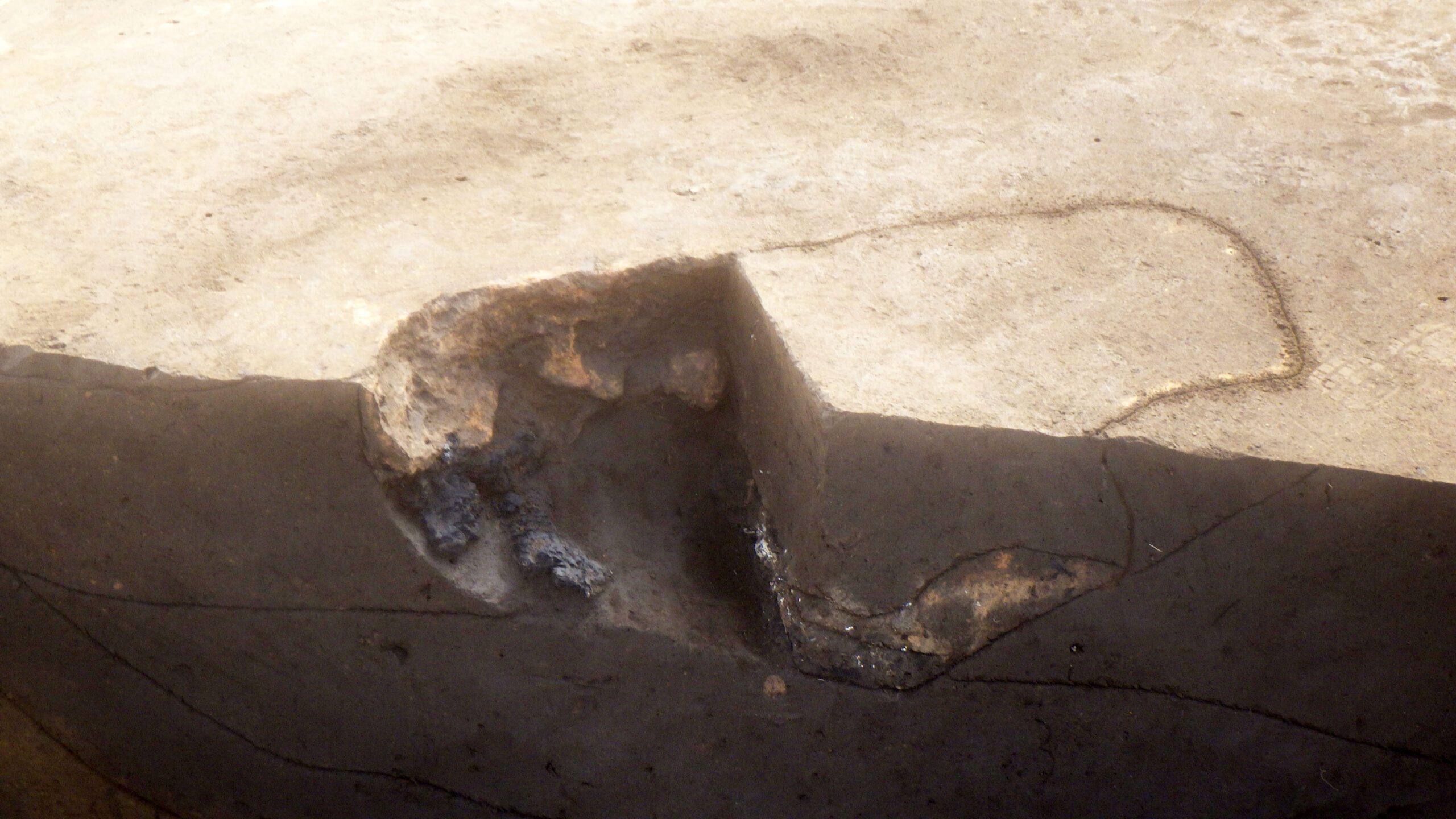 縄文時代の落とし穴です。出土遺物が極めて少なく、いつ頃作られたものか特定が難しいのですが、2年前に近接地点から同様の遺構が発見されており、おそらく縄文時代早期に造られたものと考えられます。細長くて深い穴で、鹿などが落ちると足が挟まって脱出が出来ないような構造になっていたと考えられます。