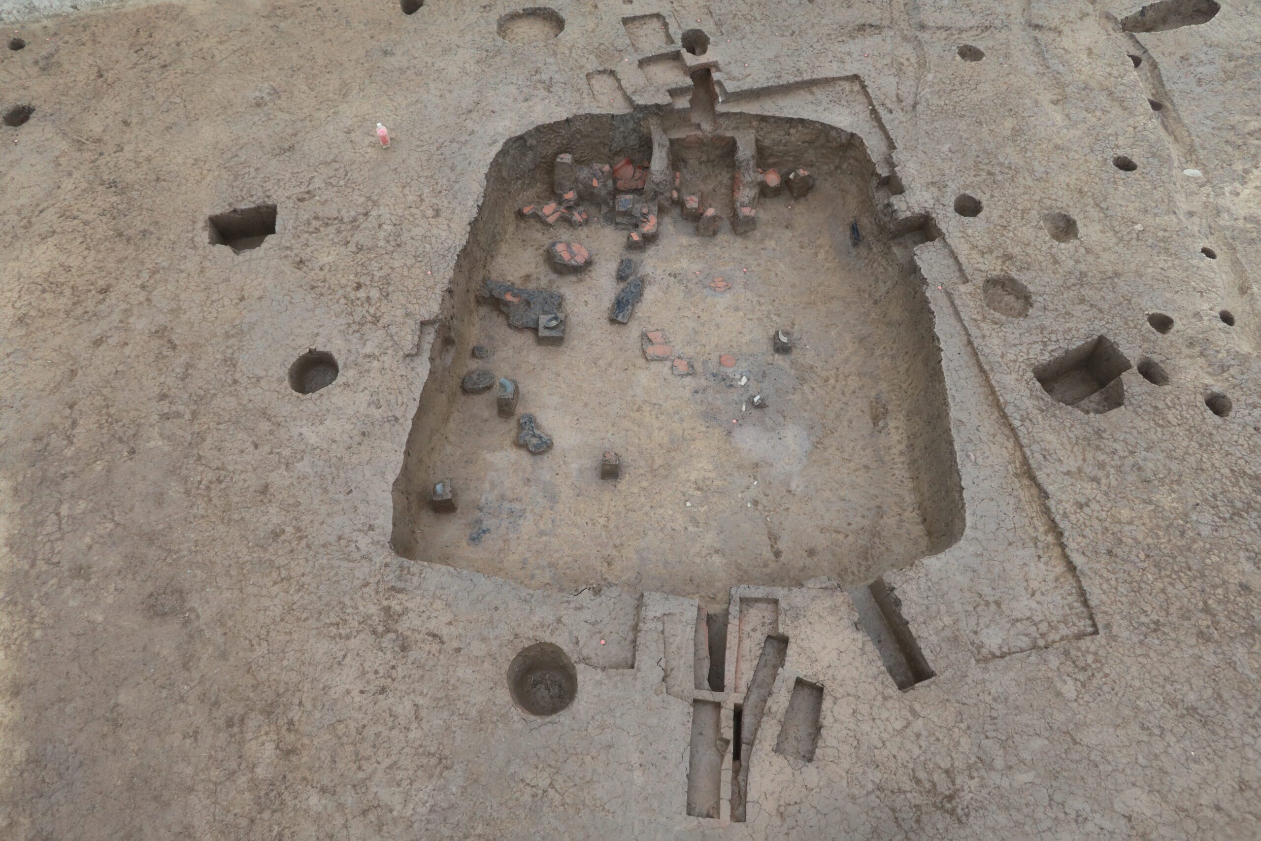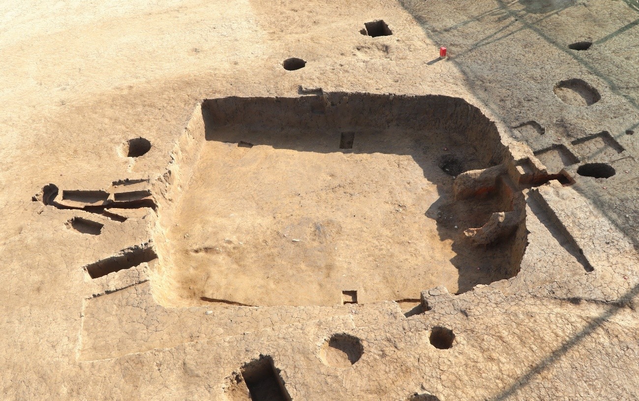 カマドが2基見つかった、奈良時代後期の竪穴住居跡です。床面からたくさんの遺物が出土しました。また炭化物が多く確認されているので、火災に遭った住居跡の可能性もあります。
