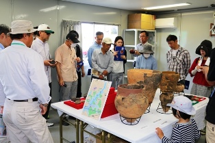 今回、見学会を開催した中平遺跡は、南向の斜面に広がる平安時代を中心としたムラの跡で、多くの竪穴住居跡や三面廂(さんめんびさし)の大型掘立柱建物跡が見つかりました。竪穴住居跡では、古代人が煮炊きを行ったカマドの多くが東側に設置されていたことが特徴です。遺物展示室では須恵器や土師器、糸を紡ぐ紡錘車もご覧いただきました。
